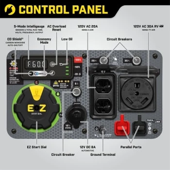 - Monitor voltage, frequency, and operating hours with ease, plus features CO Shield™ carbon monoxide auto shutoff system, and the EZ Start Dial simplifies startup while Economy Mode monitors power consumption in real time
