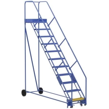 - Finally an easy and safe solution for reaching products on high-shelf. Constructed of square tubing framework which handles uniform capacities up to 350 lb units feature a 58° climb angle and EZ models feature a 50° climb angle. The handrail height is 30″. Each step is 24″W x 7″D choose either grip strut style or perforated style steps. Front wheels are 10″ Dia. Unique design allows ladder to separate for shipping and storage. Welded steel construction with powder-coated finish. Manufactured in compliance with OSHA 1910.29 and ANSI A14.7 standards. Units are shipped as knockdown assembling required.