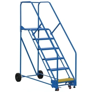 - Finally an easy and safe solution for reaching products on high-shelf. Constructed of square tubing framework which handles uniform capacities up to 350 lb units feature a 58° climb angle and EZ models feature a 50° climb angle. The handrail height is 30″. Each step is 24″W x 7″D choose either grip strut style or perforated style steps. Front wheels are 10″ Dia. Unique design allows ladder to separate for shipping and storage. Welded steel construction with powder-coated finish. Manufactured in compliance with OSHA 1910.29 and ANSI A14.7 standards. Units are shipped as knockdown assembling required.
