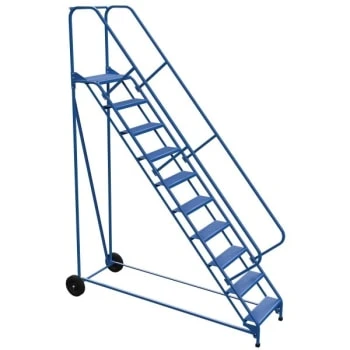 - Portable ladder conveniently folds for storage. Constructed of square tubing framework which handles capacities up to 350 lb Features 30″H removable hand railing. While 12 step models feature a 36″ removable hand railing 14″D top platform and a blue baked-in powder-coated toughness with 11- and 12-Step models an industrial blue painted finish. Each step measures 16-13/16″W x 7″D and is spaced 10″ apart. Models with 8- and 12-Steps have steps that measure 23-9/16″W. Unit rolls around on two large 10″ x 2-1/2″ hard rubber wheels. Units are shipped crated some assembly required. Complies with ANSI A14.7 and OSHA 1910.29 specifications.