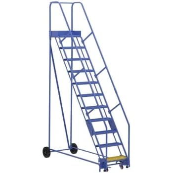 - Finally an easy and safe solution for reaching products on high-shelf. Constructed of square tubing framework which handles uniform capacities up to 350 lb units feature a 58° climb angle and EZ models feature a 50° climb angle. The handrail height is 30″. Each step is 24″W x 7″D choose either grip strut style or perforated style steps. Front wheels are 10″ Dia. Unique design allows ladder to separate for shipping and storage. Welded steel construction with powder-coated finish. Manufactured in compliance with OSHA 1910.29 and ANSI A14.7 standards. Units are shipped as knockdown assembling required.