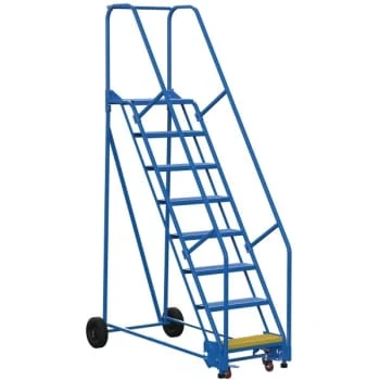 - Finally an easy and safe solution for reaching products on high-shelf. Constructed of square tubing framework which handles uniform capacities up to 350 lb units feature a 58° climb angle and EZ models feature a 50° climb angle. The handrail height is 30″. Each step is 24″W x 7″D choose either grip strut style or perforated style steps. Front wheels are 10″ Dia. Unique design allows ladder to separate for shipping and storage. Welded steel construction with powder-coated finish. Manufactured in compliance with OSHA 1910.29 and ANSI A14.7 standards. Units are shipped as knockdown assembling required.