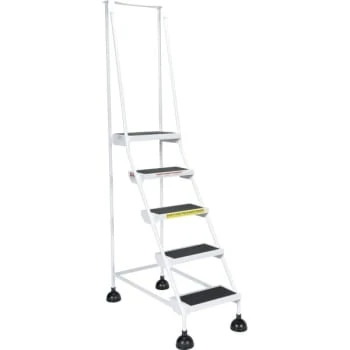 - Commercial users of rolling ladders now have an attractive and economical alternative to the traditional warehouse rolling ladders. This sleek design also provides maximum safety and convenience. The all directional spring-loaded swivel casters feature steel dome protection and include rubber pad bottoms to minimize movement. Climb angle is 58°. The top step is 16″W x 11″D while the remainder steps measure 16″W x 8″D. The powder-coated finish provides a durable attractive appearance. 300 lb Capacity.