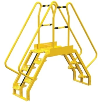 - The 5-Step alternating step crossover ladder 56° angle with 20″ clear span is perfect where you need permanent access at crossover points. Alternating step design for shorter overall span than other units. The upper platform features removable 2-sided high-handrail with mid-rail and fixed toe boards to prevent objects from rolling off. Includes lag-down points for securing to floor.